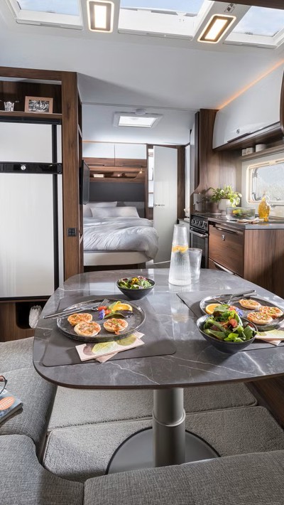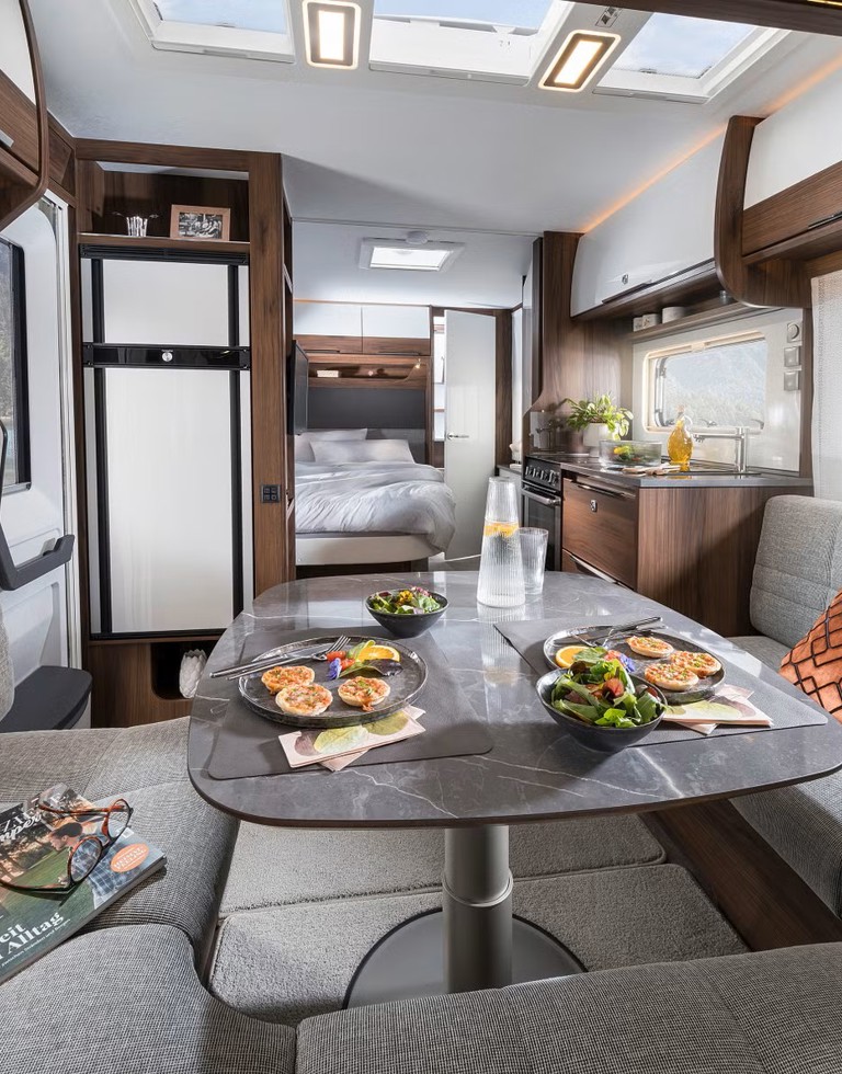 Diamant-serien udstråler elegance med sin slanke, tidløse silhuet og elegante detaljer. Den ydre finish er præget af højkvalitets materialer og en sofistikeret farvepalette, der signalerer luksus og raffinement. Det rene, minimalistiske design kombinerer funktionalitet med æstetik, hvilket gør campingvognen til et ægte blikfang.