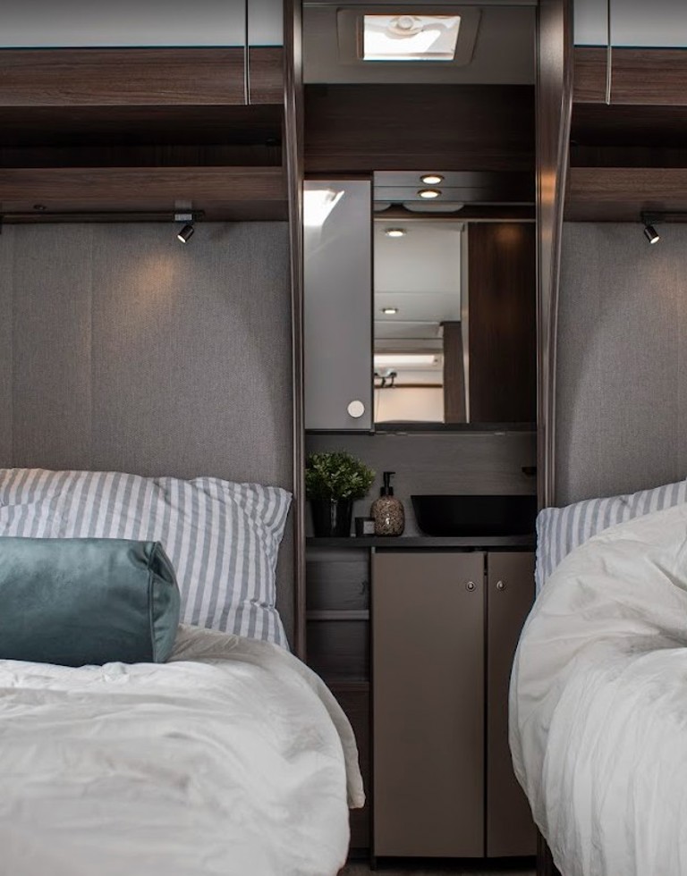 I Chimera 730 er elektrisk ovn og mikroovn placeret i et Polar-tårn, i den mindre vognstørrelse får du gasovn og mikroovn separat. For begge størrelser inkluderes aircondition og centralstøvsuger som standard. Hvis du ønsker det, kan du skabe dit eget premiumkøkken ved at tilføje et vinkøleskab. Grundplanerne, materialer/tekstiler og standardudstyret er helt eksklusive for Chimera-serien. Denne niveau tilbyder vi i en grundplan til 590 og i tre varianter til størrelse 730. Dette er en vogn, der skal opleves!